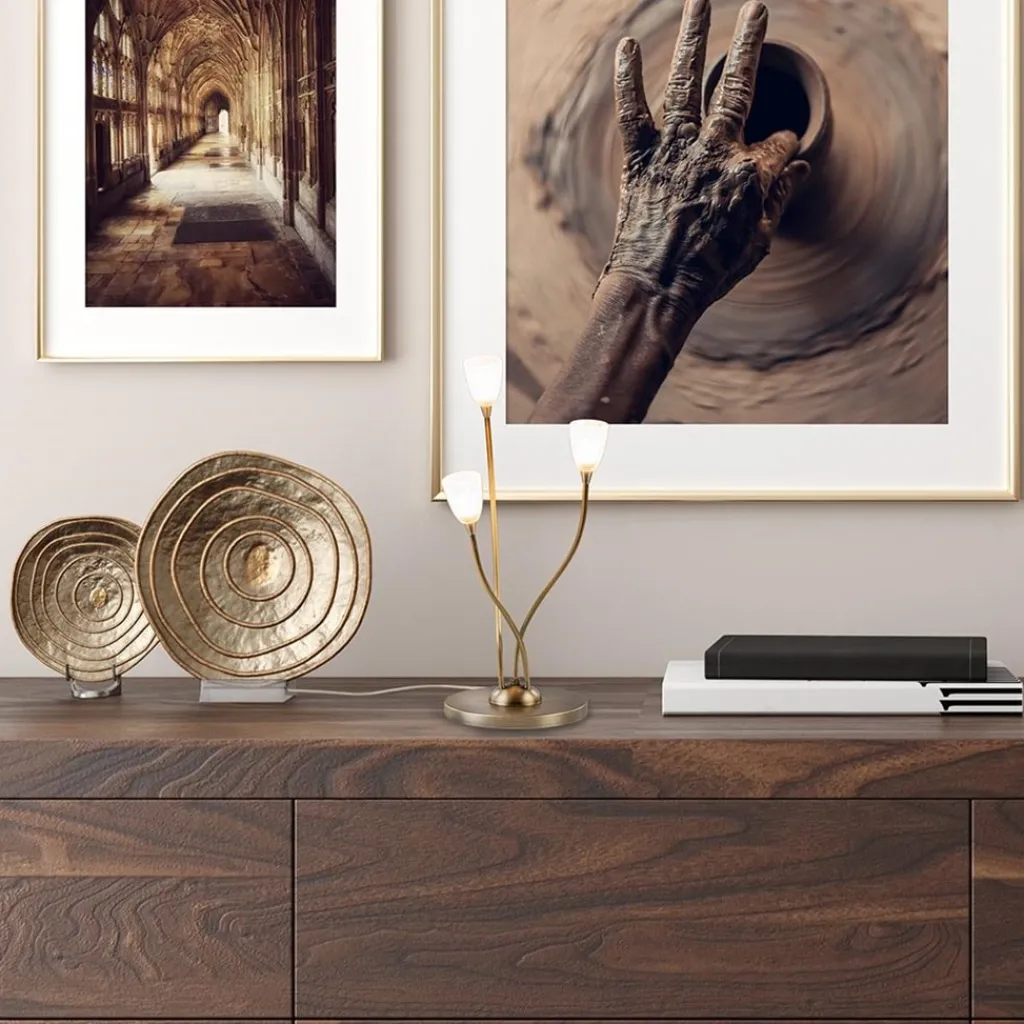 Een mooie klassieke tafellamp in een modern jasje. Deze bronzen tafellamp is voorzien van wit gevlamde glazen kapjes welke sfeervol oplichten wanneer de lamp wordt ingeschakeld. Het armatuur is op speelse wijze in elkaar gezet en is bovenop de voet voorzien van de aan/uit schakelaar welke tevens dient als dimmer. De tafellamp is voorzien van geïntegreerd LED met een dim to warm functie. Hoe meer u dimt, hoe warmer de kleur en hoe sfeervoller de verlichting. Dit werkt gemakkelijk door de dimmer even ingedrukt te houden. Zo creëert u snel de juiste sfeer voor ieder moment. Door het formaat past de tafellamp prima op een dressoir, bijzettafel of het nachtkastje. De klassieke LED tafellamp heeft een transparant snoer met een lengte van 185 cm.