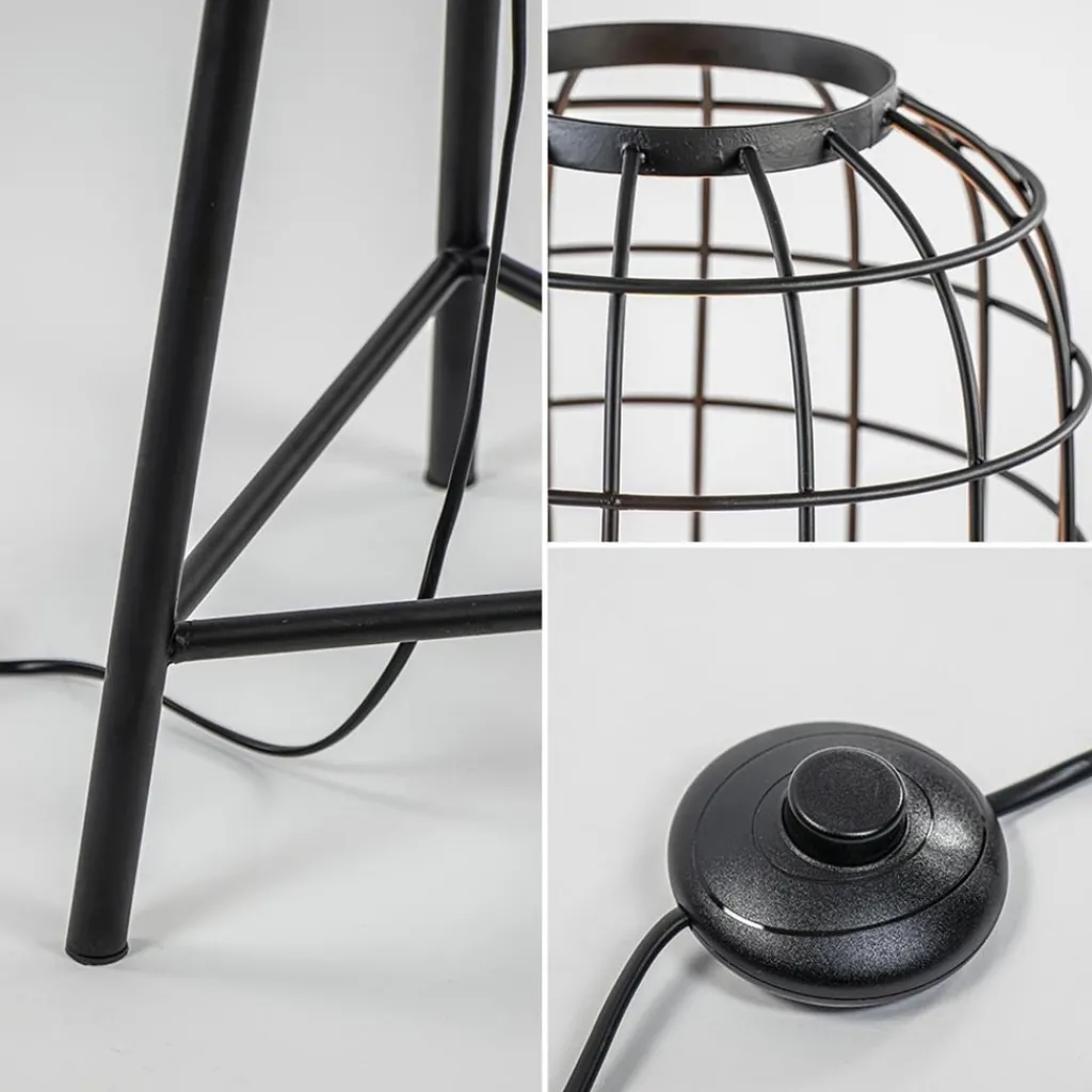 Een stoere vloerlamp die mooi is toe te passen in diverse woonstijlen als landelijk of industrieel. De driepoot vloerlamp is volledig van metaal en voorzien van een grote kooi als kap. Binnenin de kooi bevindt zich een bronzen E27 fitting. Door de hoogte van de kooi kan er gebruik worden gemaakt van een grote decoratieve lichtbron. Vloerlamp Toah heeft een zwart snoer met een lengte van 330 cm en een voetschakelaar op 200 cm.