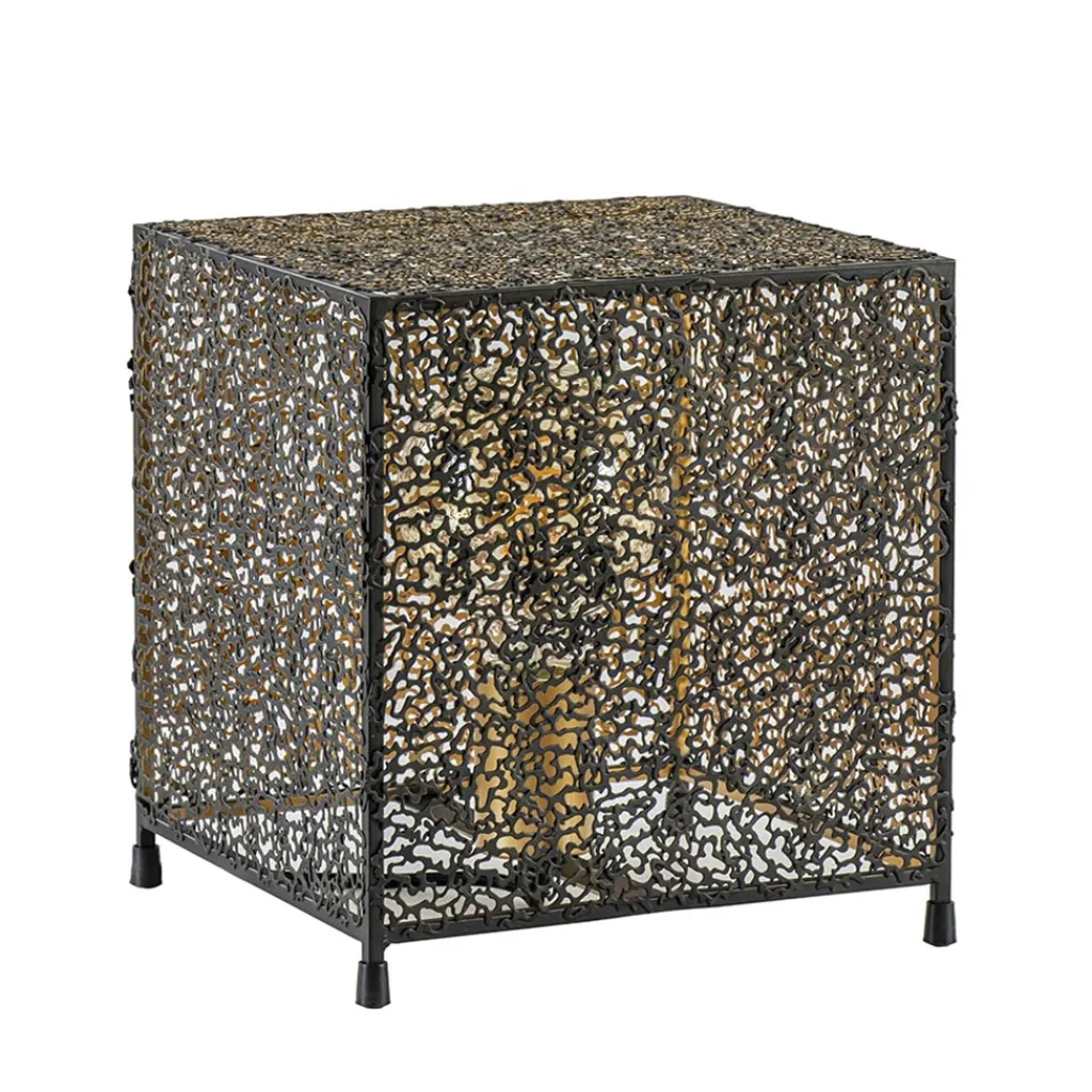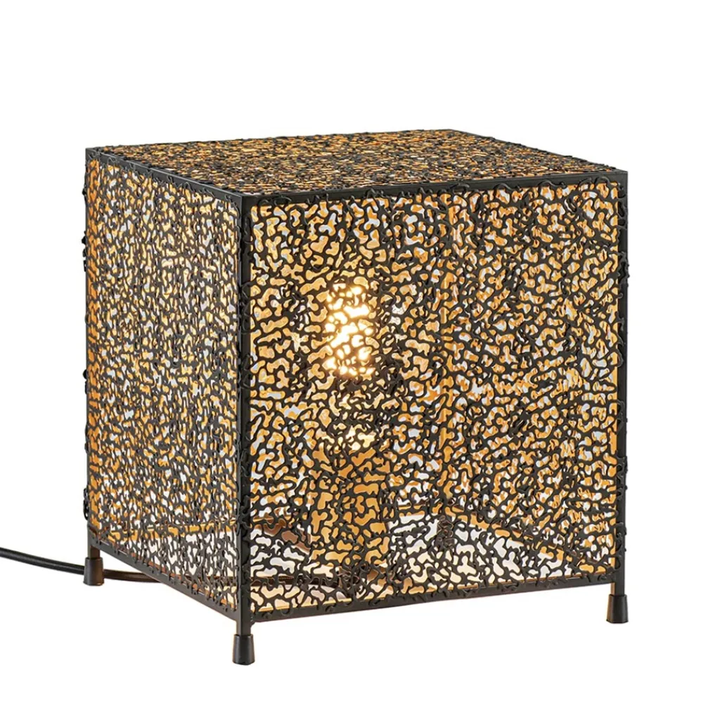 Stoer met een chique uitstraling. Deze moderne tafellamp doet een beetje denken aan koraal en is gemaakt uit kleine metaaldeeltjes die samen een vierkante kap vormen. Het metaal is afgewerkt met een mat zwarte finish aan de buitenzijde en een gouden finish aan de binnenzijde. Het goud zorgt voor een chique uitstraling en creëert een sfeervolle warme gloed. De tafellamp wordt geleverd inclusief zwart snoer van 200 CM. De schakelaar bevindt zich op 50 CM van het armatuur. Het tafellampje staat op vier sierlijke pootjes.