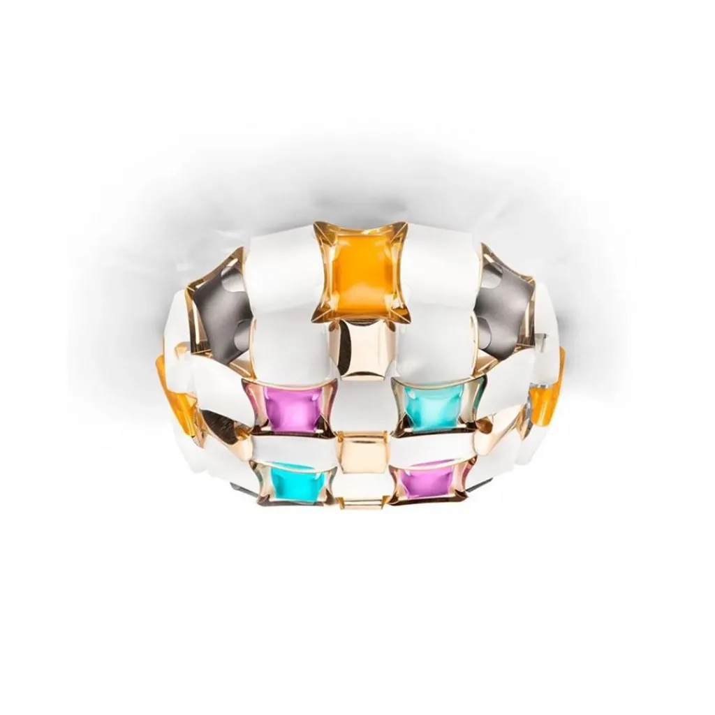 Design van Italiaans komaf. Deze luxe plafondlamp van ‘Slamp’ is ontworpen door Adriano Rachele en straalt een en al luxe en glamour uit. De plafonnière is geïnspireerd op juwelen uit de haute couture. De plafondlamp doet dan ook meteen denken aan edelstenen en diamanten. De geometrische kap bestaat uit losse elementen die samen de kap vormen en zijn gemaakt van opalflex en lentiflex, beide materialen die zorgen voor de extra luxe uitstraling. De kap wordt met een magnetisch ophangsysteem aan de bevestiging opgehangen en de lamp is geschikt voor zowel het plafond als de muur. Waar deze Italiaanse designlamp ook komt te hangen, het geeft meteen sfeer, luxe en vooral glamour aan het interieur.
