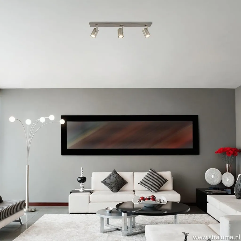 Ideaal voor in een smalle kamer of hal. Deze 3-lichts opbouwspot zorgt voor voldoende licht en doordat de spots zowel te kantelen als te draaien zijn, stelt u de spots gemakkelijk en snel naar de juiste richting. De ronde spots zijn voorzien van een afneembare ring zodat de lichtbron gemakkelijk geplaatst kan worden. De metalen kapjes zijn bevestigd op een L-vormig pootje die is bevestigd op de metalen plafondbalk. De plafondspot krijgt door de matte nikkel afwerking een strakke look die mooi past in diverse woonstijlen.