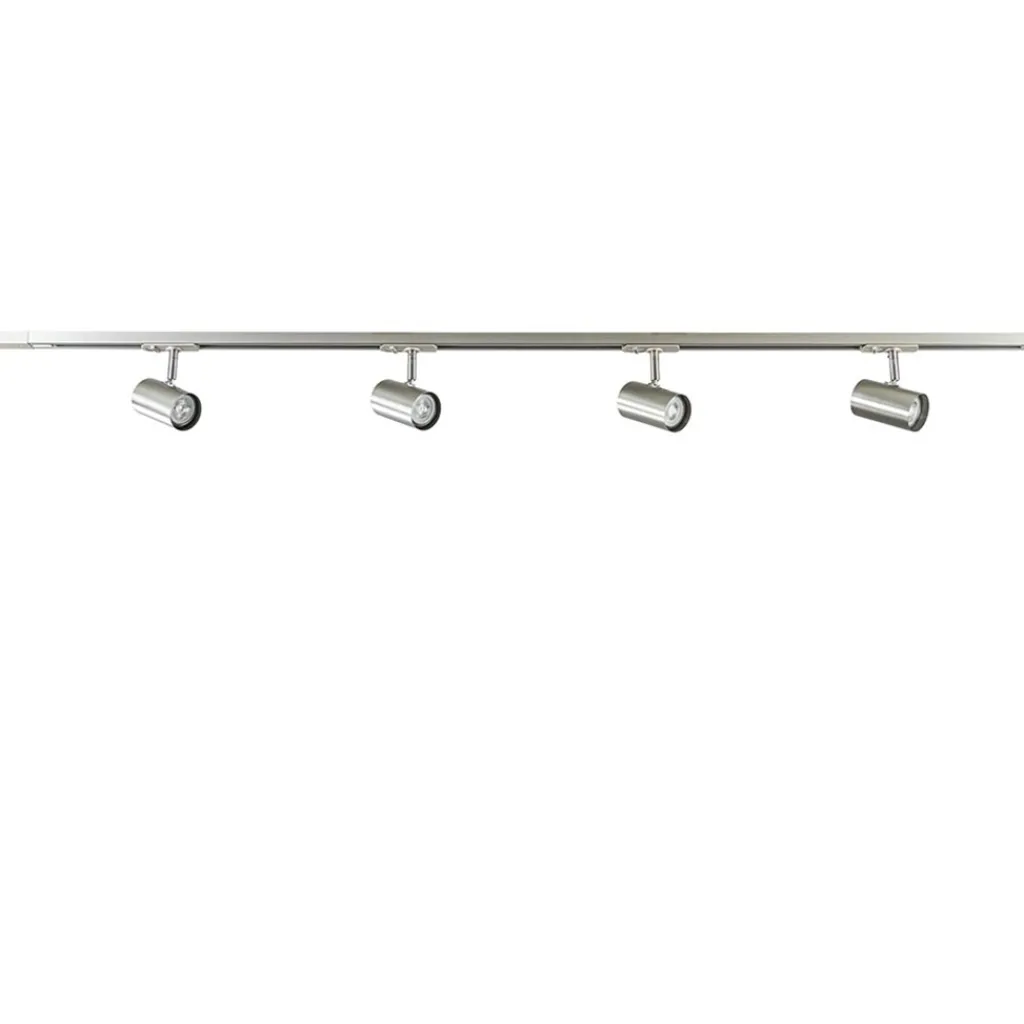 Ideaal om een ruimte extra uit te lichten of meer sfeer aan te brengen. Dit 1-fase railsysteem wordt geleverd inclusief 4 spots, beide uitgevoerd in het nikkel. De rail heeft een lengte van 150 cm waar de spots gemakkelijk op kunnen worden verdeeld. Druk de spot in de rail en zet hem vast door de knop om te zetten. De spots kunnen verder nog draaien en kantelen. Bepaal dus zelf hoe u het licht wilt verspreiden. Het railsysteem heeft 1-fase, dit houdt in dat alle lampen tegelijk zullen worden in- en uitgeschakeld. Handig voor in een lange hal of slaapkamer, maar ook in de keuken of woonkamer past dit systeem perfect. De smalle rail en de cilindervormige spots geven een strak en modern geheel aan de ruimte. Het nikkel railsysteem is dimbaar met een externe dimmer.