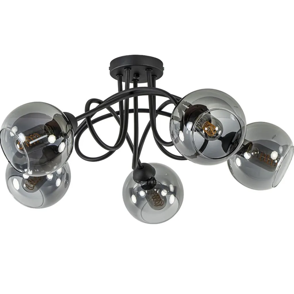 Sierlijke trendy 5-lichts plafondlamp. Deze mat zwarte plafondlamp is een leuke combinatie tussen stoer en sierlijk. Het fraaie armatuur loopt krullend in elkaar over. De smoke glazen bollen geven de lamp dat stoere en ook luxe randje. De lamp is leuk voor in een woonkamer, slaapkamer of grote hal. De lamp wordt exclusief lichtbronnen geleverd en is dimbaar middels een externe dimmer (exclusief).