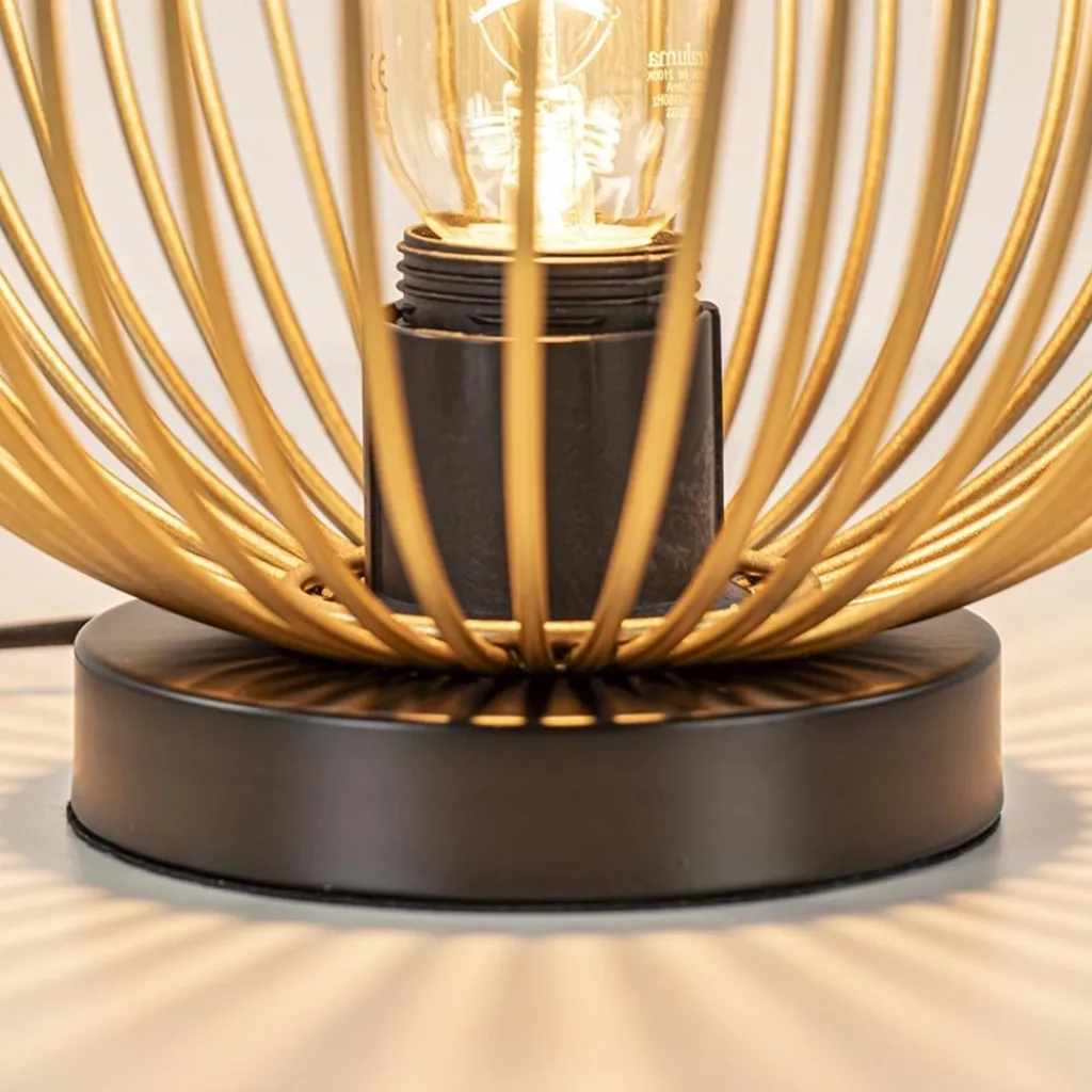 Een leuke trendy tafellamp met een fijne lichtverspreiding. Door de spijlen heeft de lamp een open structuur waardoor er veel licht kan worden verspreid. De tafellamp is gemaakt van metaal en uitgevoerd in het goud met zwart. De gouden spijlen geven de lamp een speelse look. De tafellamp is voorzien van een zwart snoer met een lengte van 185 cm. De lichtbron is exclusief.
