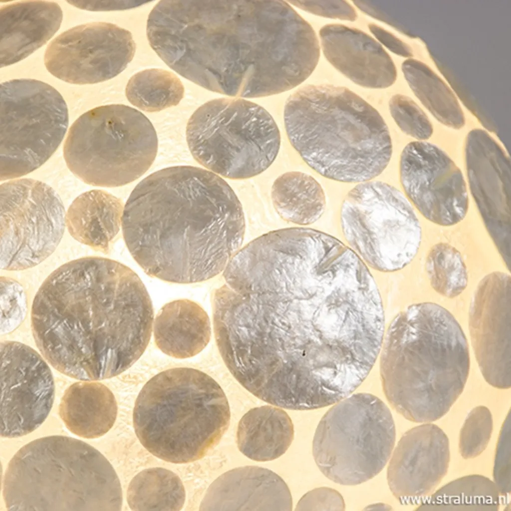 Deze sfeervolle bol brengt het strand in huis. De tafellamp is gemaakt van Capiz schelpen en brengt een warme en gezellige sfeer met zich mee. Zowel aan als uit is de schelpenlamp leuk om naar te kijken, maar vooral aan valt de lamp meteen op en geeft een sfeervolle verlichting. Deze bolvormige tafellamp heeft een zwart snoer met schakelaar.