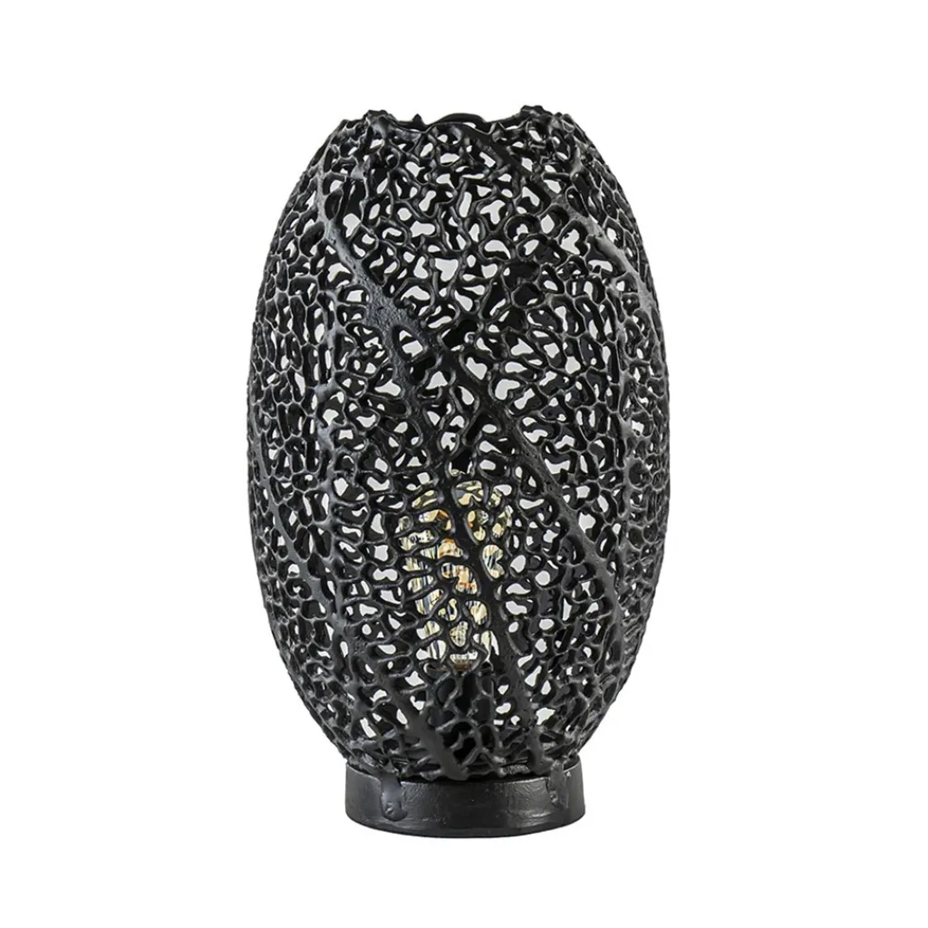 Deze mat zwarte tafellamp heeft een organisch opengewerkt patroon dat doet denken aan de nerven van een blad. Dit geeft de tafellamp een dramatisch uiterlijk. Uitstekend geschikt voor het botanische interieur, maar deze tafellamp sluit ook perfect aan bij het wabi sabi gevoel van het Japandi interieur. Deze lamp staat mooi in de woonkamer op het dressoir of de vensterbank, maar ook in de hal of de slaapkamer! Door de open structuur raden wij u aan om te kiezen voor een decoratieve lichtbron.