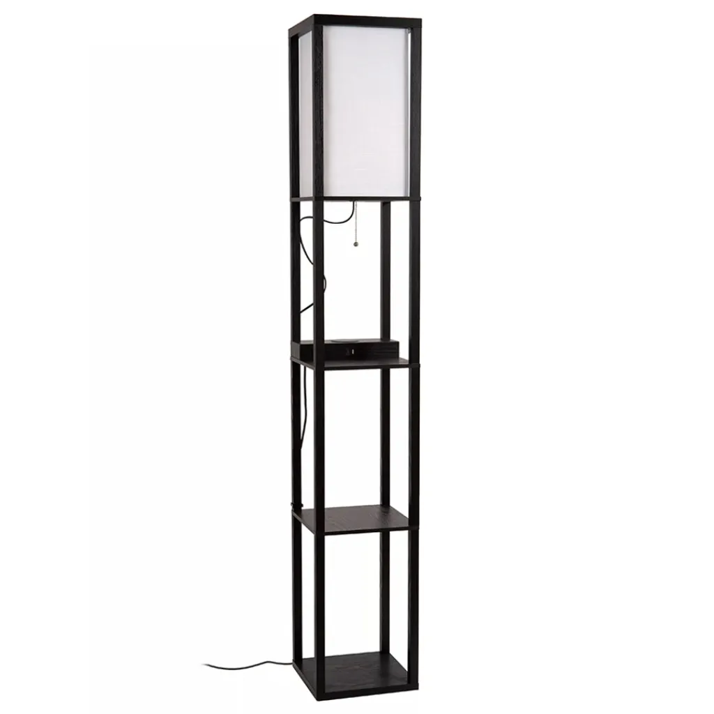 Deze sfeervolle vloerlamp is gemaakt van hoogwaardig mdf en uitgevoerd in het mat zwart. Dit is mooi gecombineerd met een beige kantoenen kap die zorgt voor diffuus licht in de ruimte. Leuke eigenschap van deze vloerlamp is het oplaadplatform op het bovenste plankje. Deze is voorzien van USB aansluitingen en een draadloze oplader. Ideaal voor in de woonkamer of slaapkamer. De overige plankjes zijn prima geschikt om wat leuke accessoires, plantjes of boeken op neer te zetten. De zwarte vloerlamp met kap is voorzien van een snoer met een lengte van 180 cm en wordt gemakkelijk aan en uit geschakeld dmv de nostalgische trekschakelaar onder de kap.