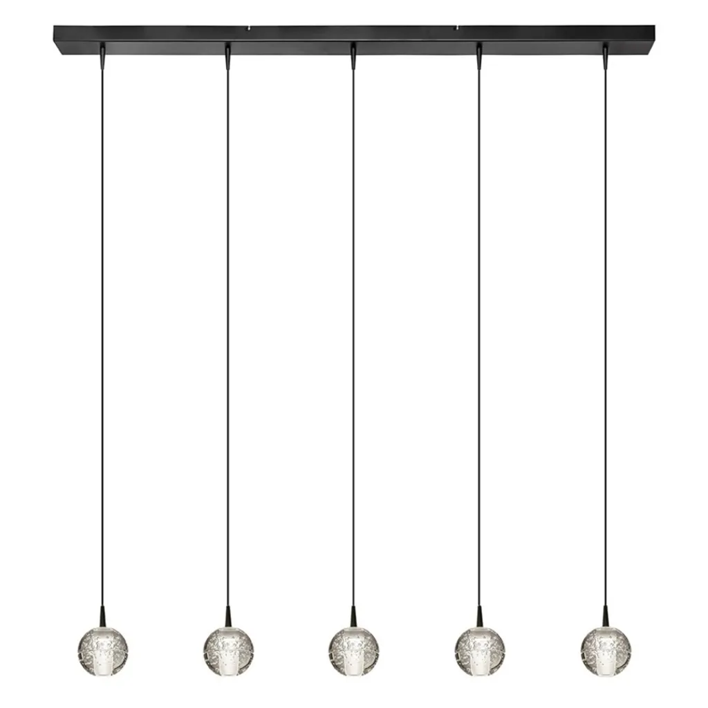 Een moderne hanglamp met een hoogwaardige kwaliteit glas. De glazen bollen zijn voorzien van een bubbel effect wat leuk oplicht wanneer de lamp wordt ingeschakeld. Binnenin de bol is het glas mat zodat er niet direct in de lichtbron kan worden gekeken. Dit is een LED lichtpunt die met 450 lumen per bol een flinke opbrengst geeft. Door middel van een externe dimmer (exclusief) zou de lamp gedimt kunnen worden. De helder glazen bollen hangen aan zwarte snoeren welke naar wens zijn in te korten. De maximale hoogte van de lamp is 135 cm. De moderne eettafelhanglamp is een fijne sfeermaker met een mooi effect.