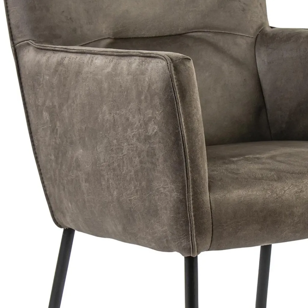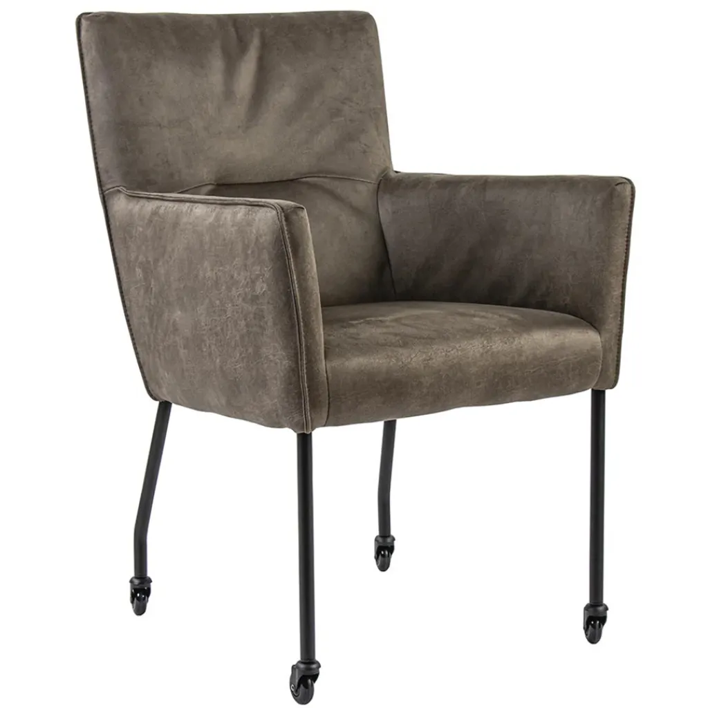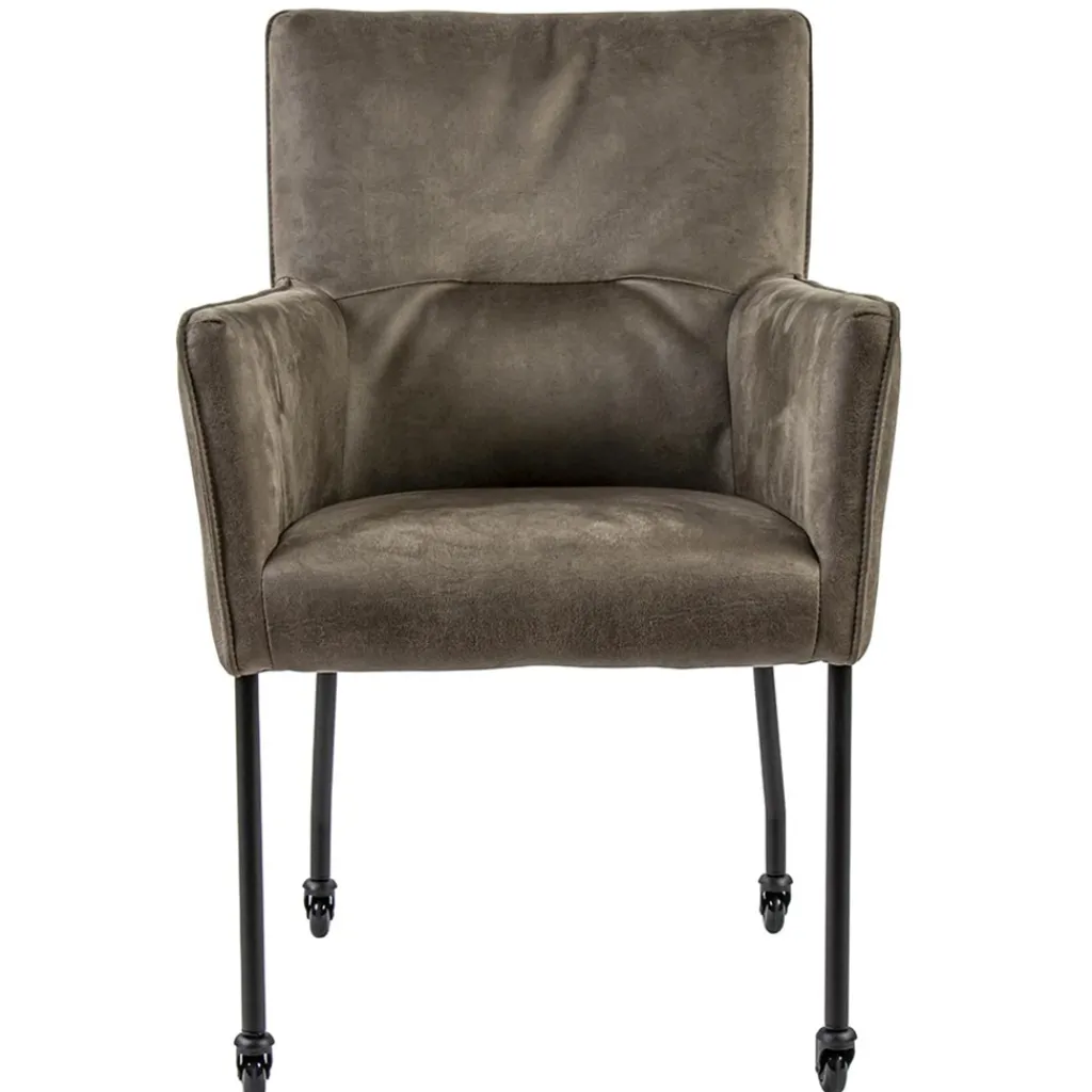 Een hele fijne eetkamerstoel om in te dineren, natafelen of zelfs te werken aan tafel. De armstoel is voorzien van wieltjes wat het aanschuiven gemakkelijk maakt. De zitting is volledig van bull leder en daardoor heel zacht. Bull leder, ook wel eco leer genoemd, is een combinatie van gerecycled buffelleer en polyester stof waardoor er een stevige kwaliteit ontstaat maar wel enorm zacht aanvoelt. Ook de armleuningen maken het natafelen nog fijner. Het bull leder is uitgevoerd in het liver en de slanke metalen pootjes in het zwart.