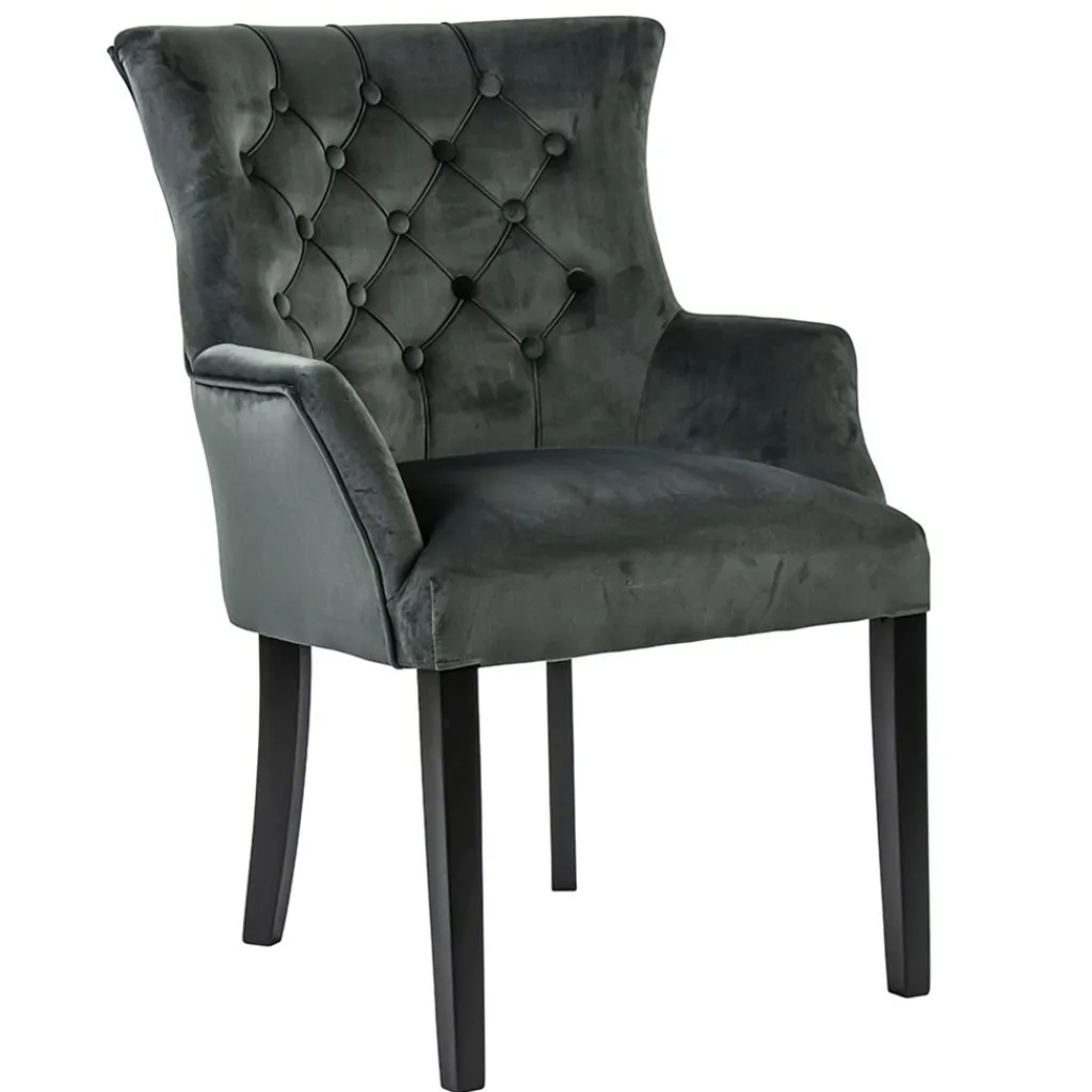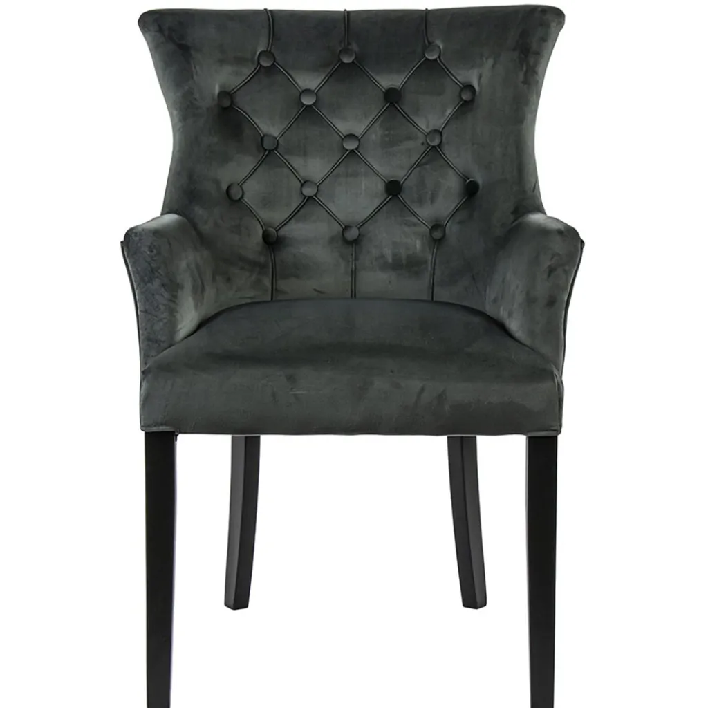Met deze comfortabele armstoel wordt dineren een waar genot. De eetkamerstoel heeft een hoog zitcomfort en biedt door de hoge rugleuning en de armleuning veel ondersteuning. De zitting is uitgevoerd in stof in een velourse kwaliteit en is mooi gecombineerd met een zwarte houten poot. De rugleuning is aan de binnenzijde gecapitonneerd wat de stoel een chique klassieke uitstraling geeft.