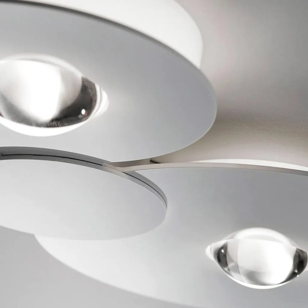 Een plafondlamp van Italiaans design. De plafonnière bestaat uit 3 ronde schijven die samen een geheel vormen. Iedere schijf heeft een andere maat waardoor het geheel een speelse vorm krijgt. In het midden van de schijven bevindt zich een LED unit. Deze geeft zowel direct als indirect licht. De design lamp geeft met 4560 lumen een flinke lichtopbrengst. De ronde schijven zijn afgewerkt in het wit wat een modern uiterlijk geeft aan de plafondlamp.