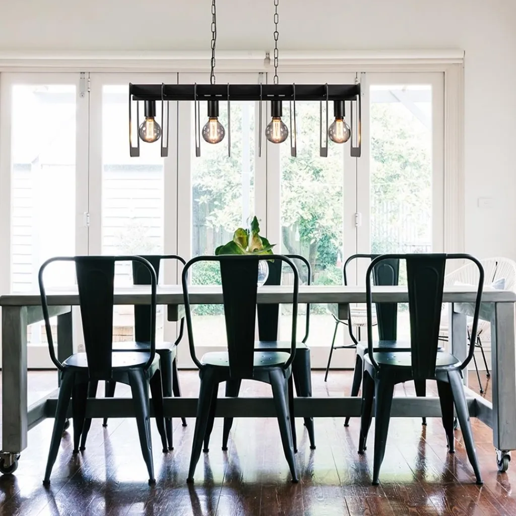 Een industriële hanglamp voor boven de eettafel. Deze mat zwarte hanglamp is volledig gemaakt van metaal en heeft zo een robuuste uitstraling. De kap bestaat uit een metalen balk waar de vierkante ringen los op worden geplaatst in de daarvoor bestemde gleuven. De middelste twee kunnen worden geplaatst door eerst de schakel in de ketting los te maken. De rechthoekige kap hangt aan twee kettingen die naar wens zijn in te korten door er schakels tussenuit te halen. De maximale hoogte van de lamp is 155 cm. De stoere hanglamp wordt met een balk van 40 cm bevestigd aan het plafond. Maak de hanglamp af met een mooie decoratieve lichtbron.