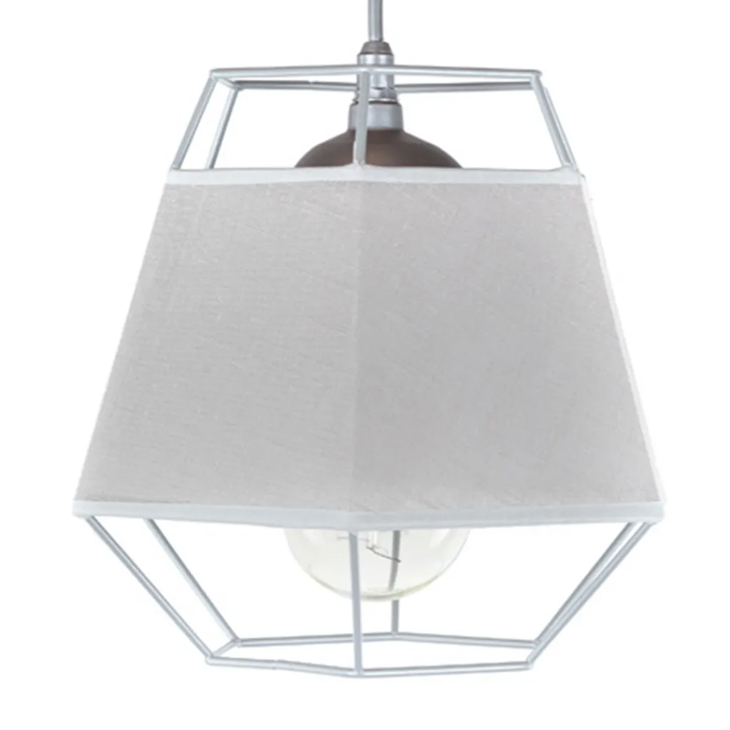 De prachtige kristalvorm van deze kleine grijze draad hanglamp een trendy look. De metalen draadlamp heeft een mat grijze afwetking. De gedeeltelijke kap in stoer linnen is een mooie combinatie met het strakke metaal. Een leuke, niet te grote hanglamp. Zeer geschikt voor bijvoorbeeld hal, toilet of met een aantal in een rij boven het aanrecht in de keuken.
