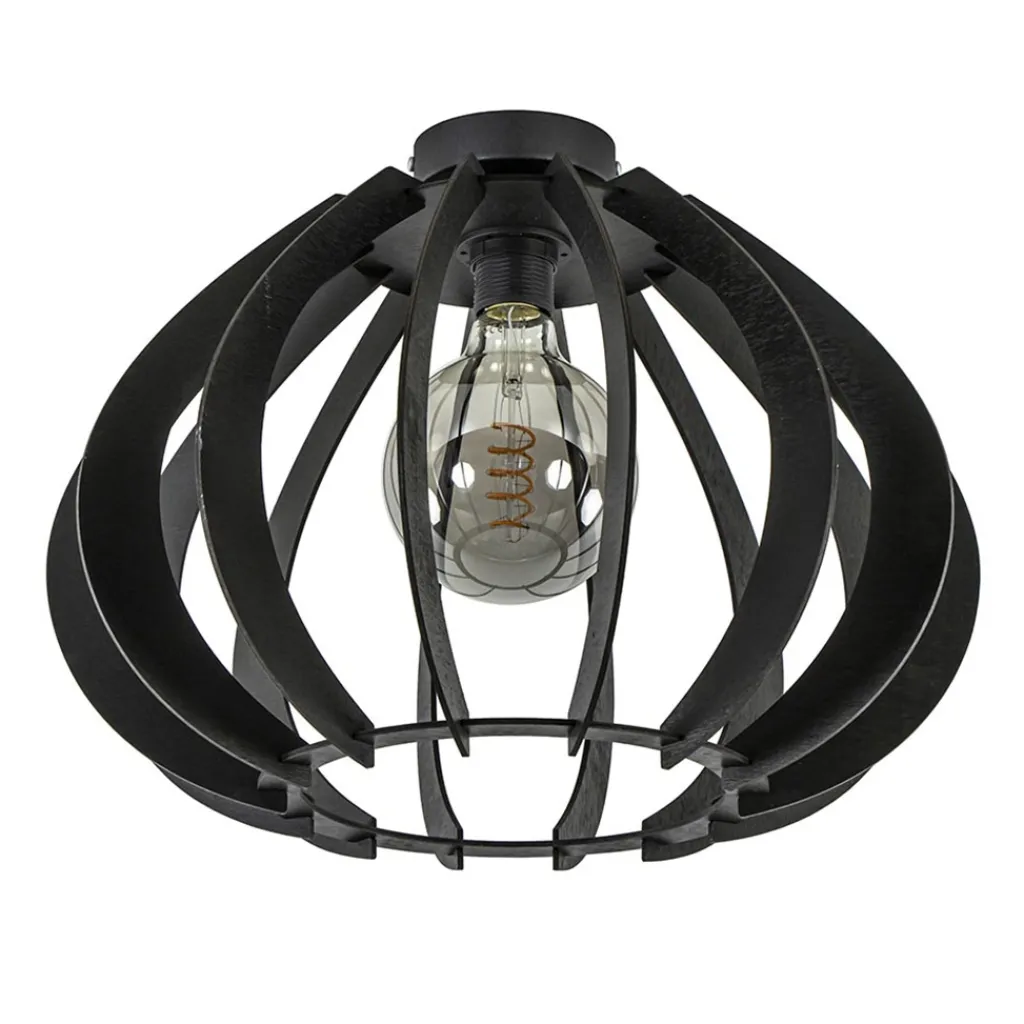 Stoere houten plafondlamp. Deze plafondlamp is een mooie toevoeging in een hal of de slaapkamer. De plafondlamp bestaat uit twee delen. De metalen bevestiging en de houten kap. Zowel de bevestiging als de kap zijn mat zwart. Door de open structuur van de lamp is een mooie decoratieve lichtbron een mooie optie. De lamp wordt exclusief lichtbron geleverd en is dimbaar middels een externe dimmer (exclusief).