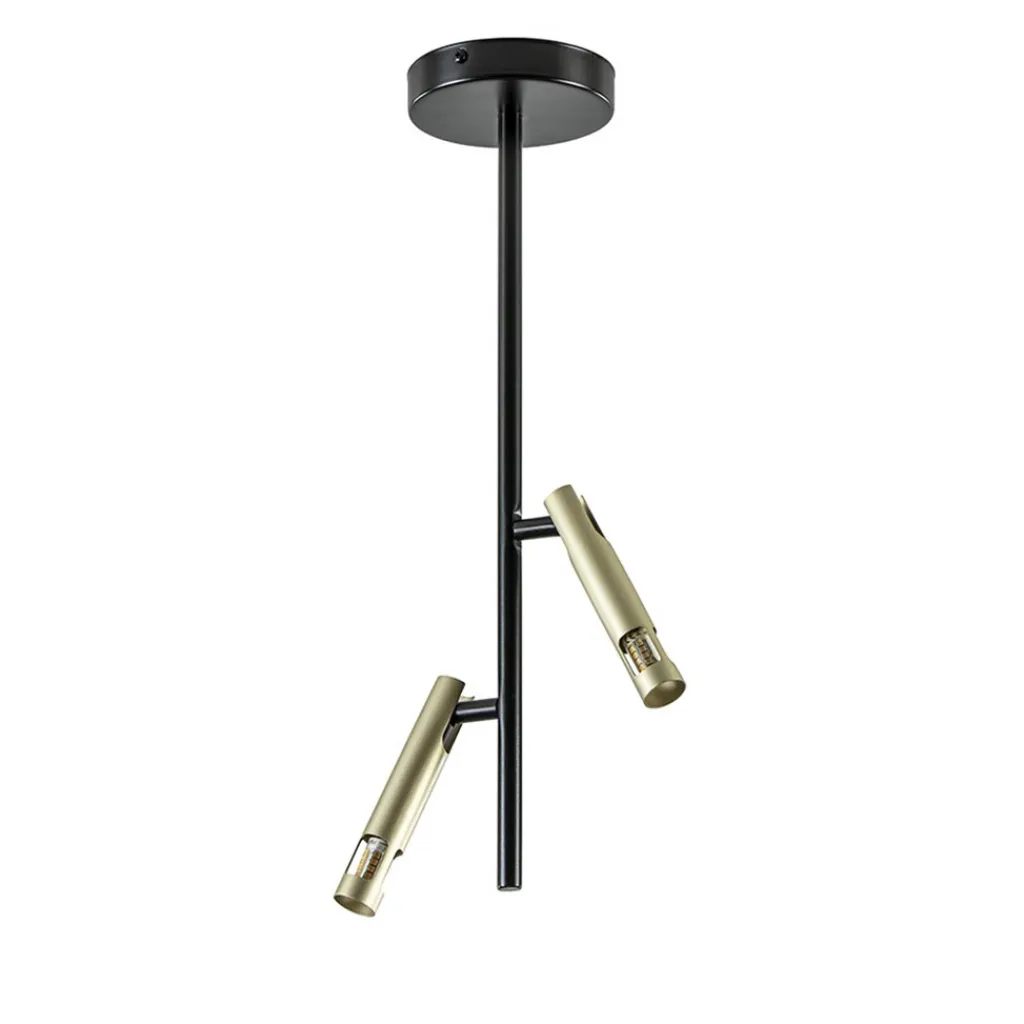 Een moderne opbouwspot met een strak minimalistisch design. De plafondlamp is volledig van metaal en uitgevoerd in het zwart met goud. Het zwarte armatuur ondersteund twee smalle gouden kappen die zijn voorzien van een G9 fitting. Beide kapjes zijn naar wens te verstellen door deze te draaien of te kantelen. De plafondlamp past prima in een hal, kleine kamer of het toilet. De G9 lichtbronnen zijn exclusief.