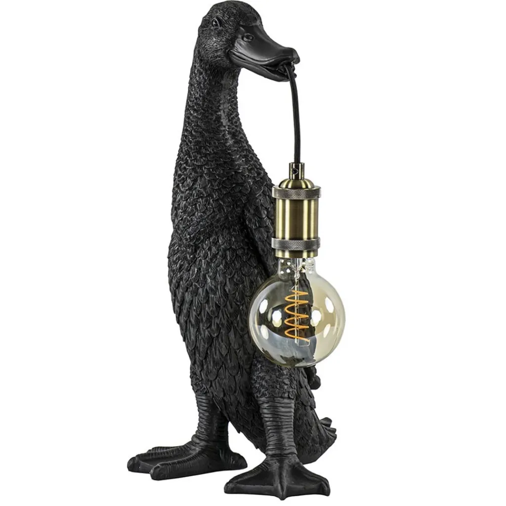 Dieren in het interieur zijn helemaal hip en happening. Zo zijn ze te vinden in prints, als accessoires maar ook als verlichting. Zo ook deze leuke tafellamp Duck. De tafellamp van Light and Living is uitgevoerd in het mat zwart. De eend houdt een bronzen fitting in z’n snavel. Erg leuk voor op een dressoir, bijzettafel of zelfs het nachtkastje. De zwarte tafellamp is voorzien van een zwart snoer met een lengte van 140 cm en wordt geleverd zonder lichtbron.