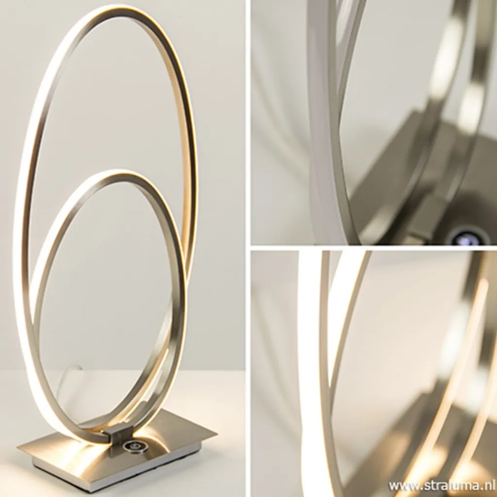 Een moderne LED tafellamp met touchdimmer. De metalen tafellamp in kleur nikkel is op de voet voorzien van een touchknop die drie dimstanden kent. De bogen van de lamp zijn volledig voorzien van LED strips wat een mooie sfeervolle verlichting geeft en ook nog eens energiezuinig is. Een ideale sfeermaker met modern design!