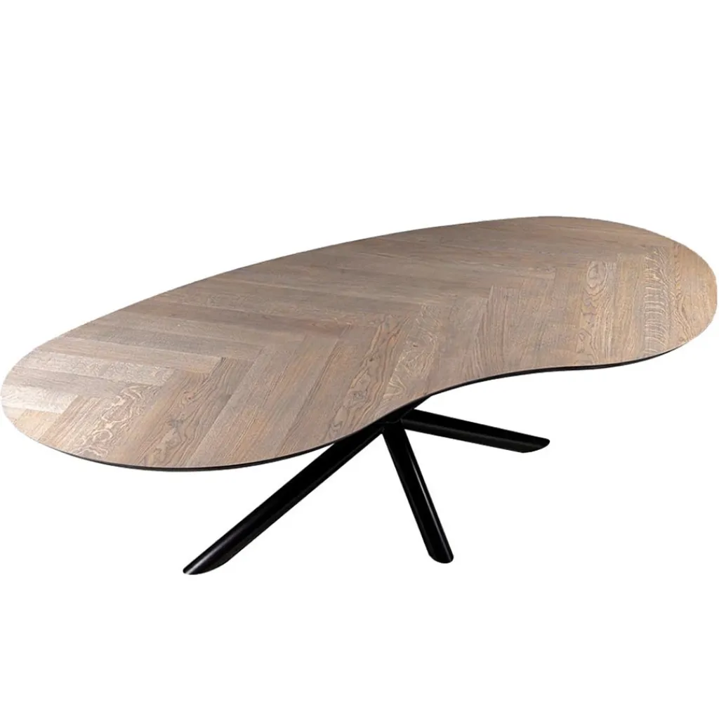 Prachtig van design deze organische ovale tafel. Een trend die steeds vaker gezien wordt. Tafel hoeven niet meer rond of rechthoekig te zijn. Ovale en organische vormen spelen steeds meer een rol. Deze prachtige design tafel heeft een eiken blad dat in visgraat is gelegd. Het blad heeft een dikte van 3 cm en is afgewerkt met een zwarte rand. Deze rand past mooi bij de zwart metalen poot. De eettafel heeft een lengte van 245 cm en een breedte van 120 cm. De tafel is prima te combineren 6 stoelen.
