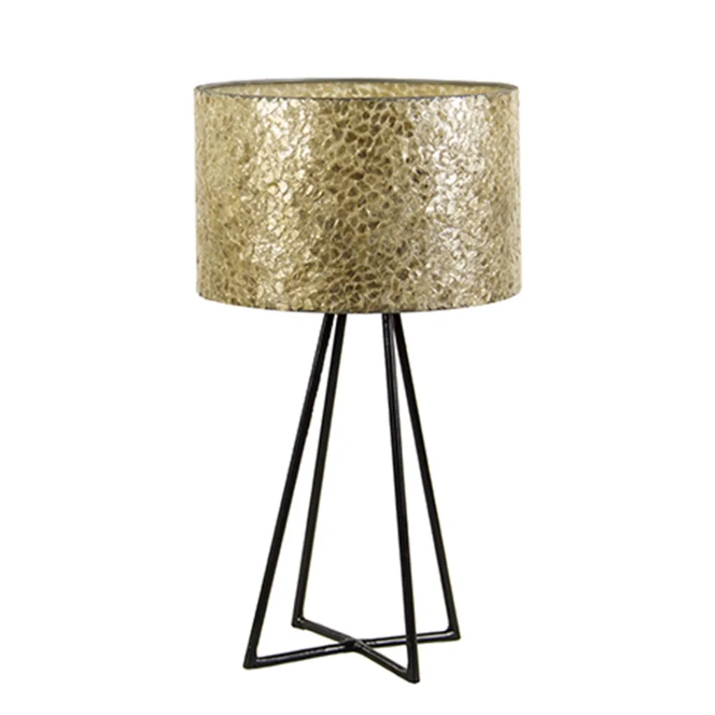 Een leuke moderne lamp met een decoratieve kap. De schelpen kap heeft een gouden kleur wat mooi past bij de zwarte metalen voet. Door de kleur en de schelpen die in de kap verwerkt zitten, geeft de lamp een mooie sfeervolle verlichting. Deze tafellamp is zowel aan als uit een mooie decoratieve toevoeging aan het interieur die zorgt voor een warme gezellige sfeer.