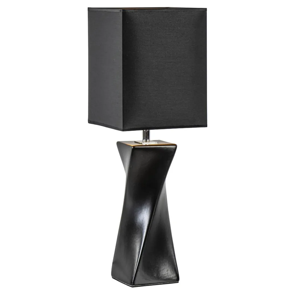 Deze chique en stijlvolle tafellamp maakt het interieur helemaal af. Passend in diverse woonstijlen is de lamp een mooie eyecatcher op een bijzettafel, sidetable of dressoir. Het gedraaide effect in de voet geeft de lamp een speelse en tegelijk luxe uitstraling die compleet wordt gemaakt door de zwarte vierkante kap. De binnenzijde van de kap is goud voor een extra glamoureuse look. De voet van de lamp is gemaakt van keramiek en mat zwart afgewerkt. De schemerlamp is voorzien van een zwart snoer met een lengte van 160 cm en een schakelaar op 45 cm. De lichtbron is exclusief.