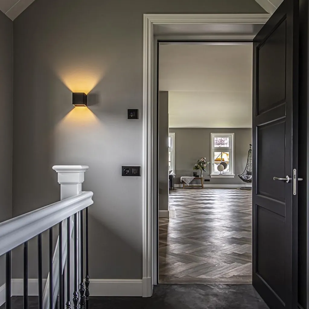 Een minimalitisch design met een sfeervol effect. Deze kleine wandlamp zorgt door het zandloper effect op de muur voor een fijne sfeerverlichting. De mat zwarte wandlamp is vierkant en van binnen voorzien van LED verlichting. Het LED geeft met 2700 Kelvin warm witte verlichting en zorgt met 600 lumen voor een prima lichtopbrengst. Het matte zwart zorgt dat de vierkante LED wandlamp mooi overloopt op een donkere wand, of juist meer opvalt op een contrasterende kleur. De zwarte kubus heeft geen snoer en dient direct op een stroompunt te worden aangesloten. Ideaal voor extra sfeer in de woonkamer, hal of slaapkamer.
